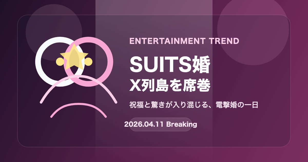 2026年4月11日、俳優・中島裕翔と女優・新木優子の結婚が発表された。ドラマ『SUITS/スーツ2』で共演した2人の交際・婚姻は「SUITS婚」としてX上でトレンド入りし、「ビジュが神すぎる」「お似合い」という声が列島を席巻した。